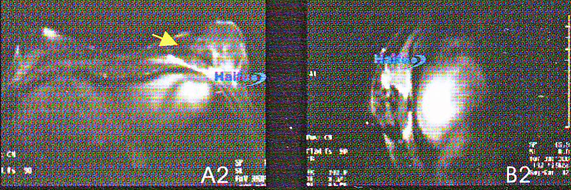 Соответствующие срезы (А2 и В2), через неделю после сеанса HIFU. После лечения накопление контрастного вещества в опухоли не происходит (стрелка).