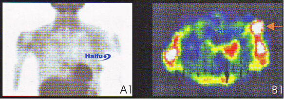 на А1 и В1 изображениях определяется зона повышенного накопления, соответствующая опухолевому узлу.