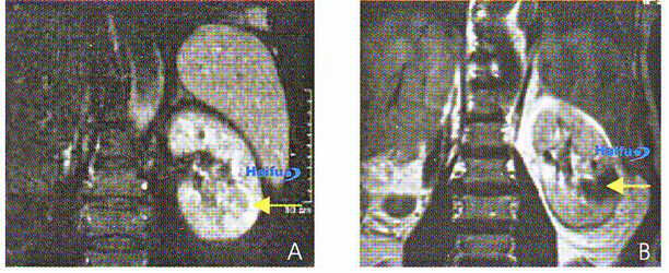 А) Коронарный срез до проведения HIFU. В опухоли определяется контрастное усиление (стрелка). В) Через 2 недели после HIFU. Накопление контрастного препарата в опухоли не определяется (коагуляционный некроз) (стрелка).